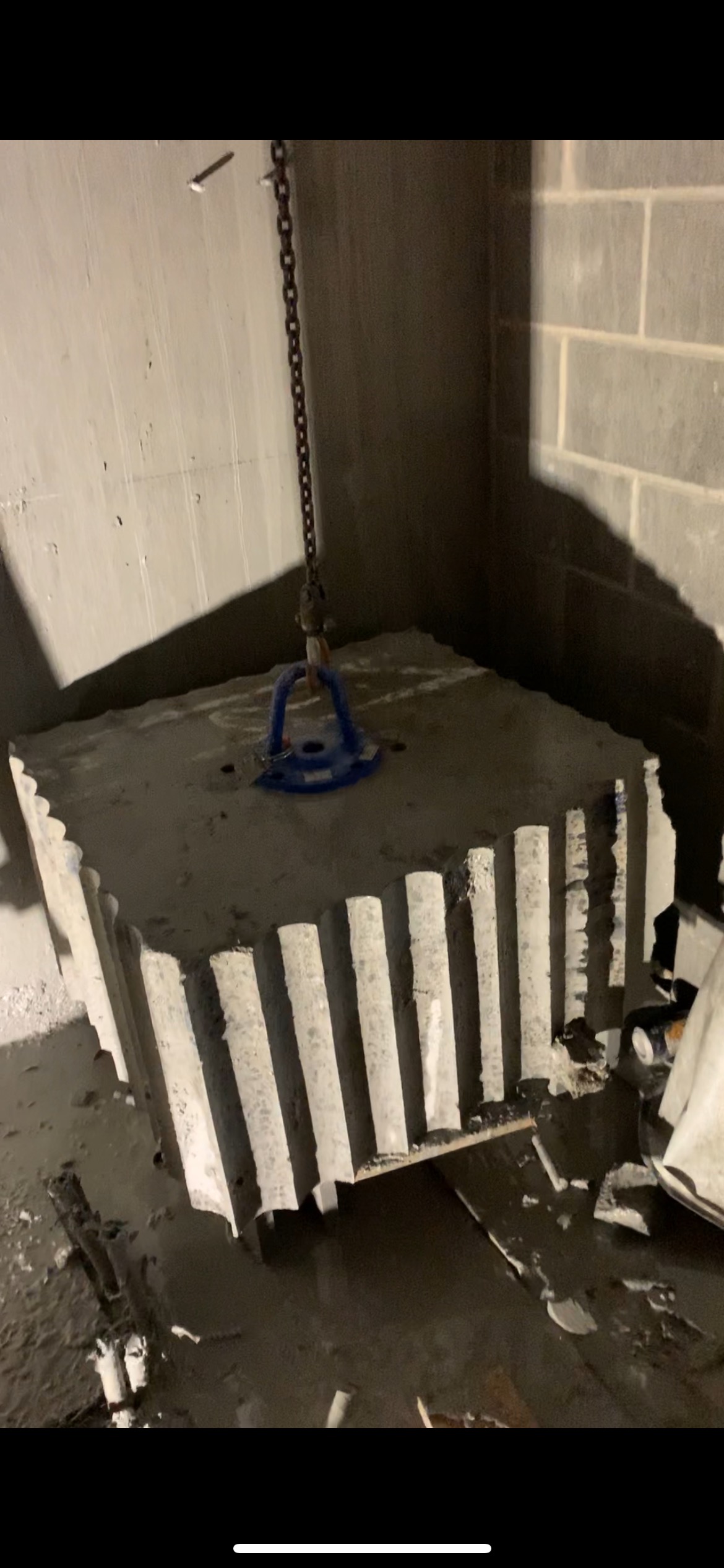To execute the work, we set up a gantry crane above the penetration area to ensure safe handling of the concrete sections. Once the blocks were secured to the gantry, we core drilled around the perimeter of each penetration to release the slabs. The blocks were then safely lowered to the floor below. This technique was repeated systematically across all four levels, ensuring a seamless and efficient outcome.