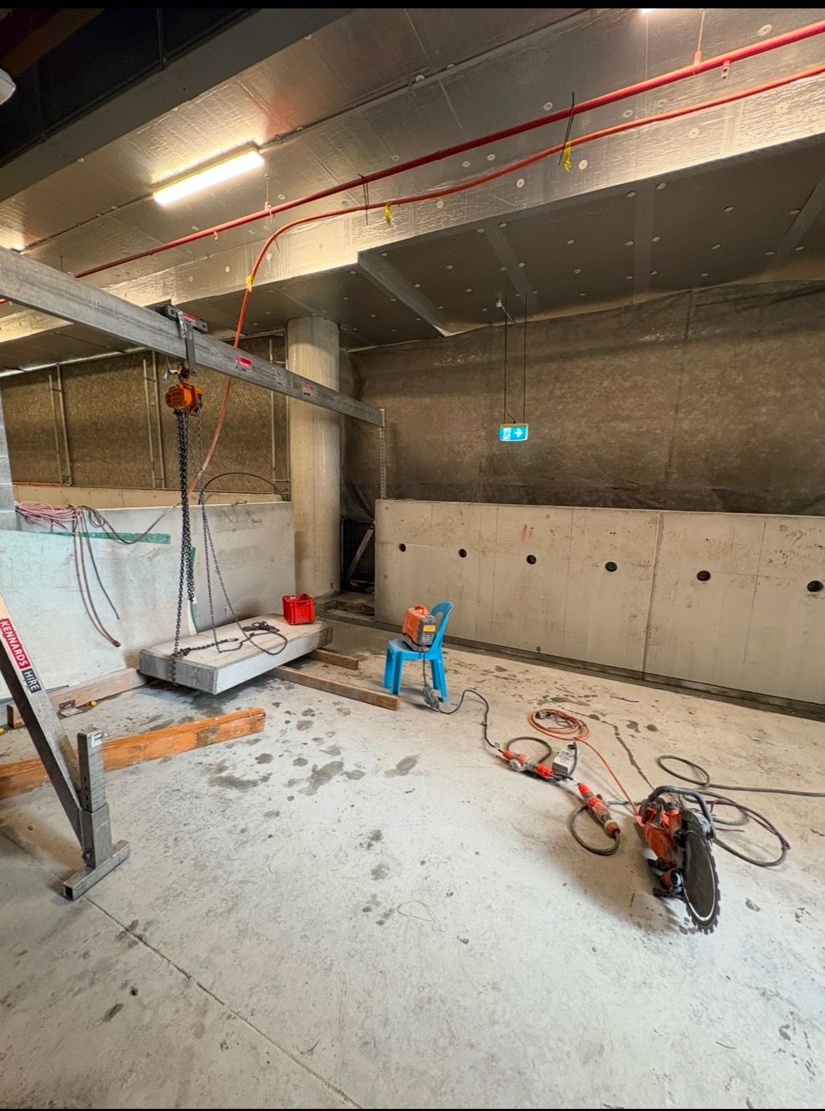 We recently completed a project that involved the removal of a concrete wall using a crane gantry, combined with precise cutting techniques. After employing a wire saw and ring saw to carefully cut each block, we utilized the crane gantry for safe and efficient removal.